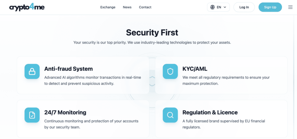 يعتبر الأمان من المجالات الرئيسية في قطاع العملات المشفرة. لذا تطبق crypto4me عدداً من التدابير التقنية والعملياتية التي تهدف إلى حماية المستخدمين.