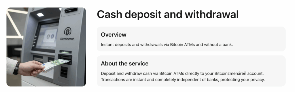 Το Bitcoinmat.sk λειτουργεί ένα δίκτυο ΑΤΜ κρυπτονομισμάτων στην Τσεχική Δημοκρατία και τη Σλοβακία. Εστιάζει στη διαθεσιμότητα των κρυπτονομισμάτων μέσω φυσικών συσκευών, οι οποίες συμπληρώνουν τα διαδικτυακά ανταλλακτήρια και τις χρηματιστηριακές αγορές. Η υπηρεσία απευθύνεται κυρίως σε χρήστες που προτιμούν τις συναλλαγές με μετρητά ή θέλουν να χρησιμοποιούν κρυπτονομίσματα μέσω συσκευών σε πραγματικό περιβάλλον.