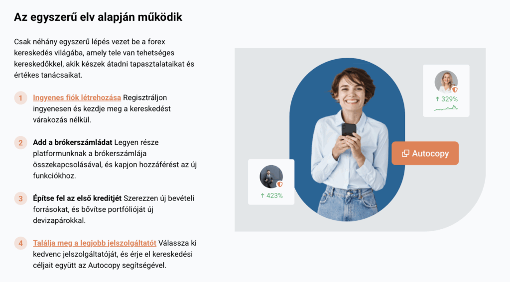 A támogató csapat gyorsan reagál és készségesen segít a platform funkcióival, a fiókok összekapcsolásával vagy az AutoCopy™ beállításokkal kapcsolatos kérdésekben. A gyors és hasznos segítségnek köszönhetően nyugodtan kereskedhet és kommunikálhat.