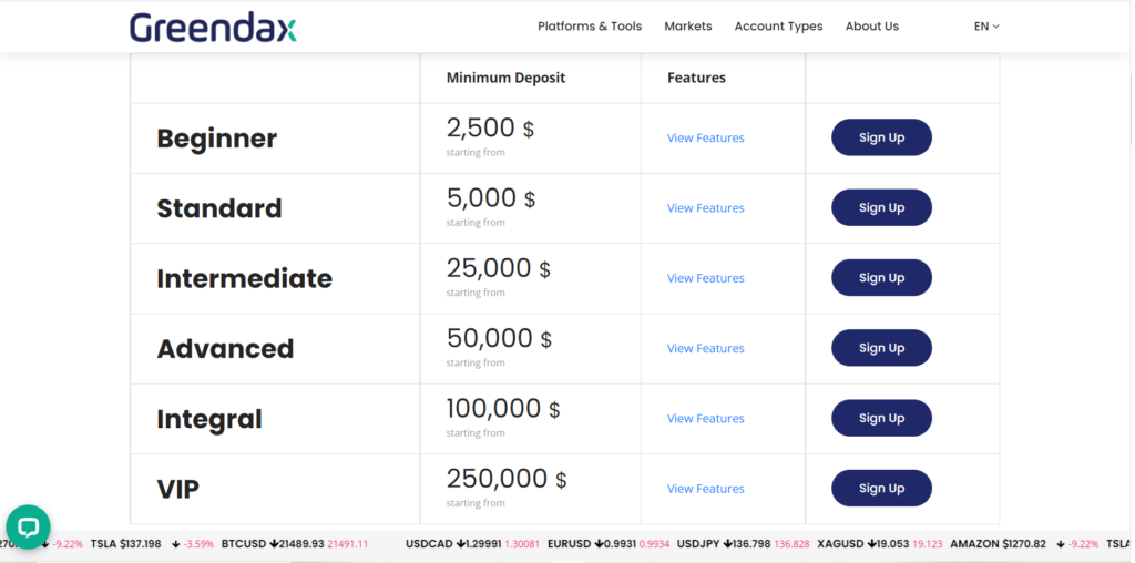 Greendax offers maximum leverage of 1:400, variable spreads, and minimum deposit of $2,500. Deposits can be made through bank transfers, bitcoin, and master/visa cards.